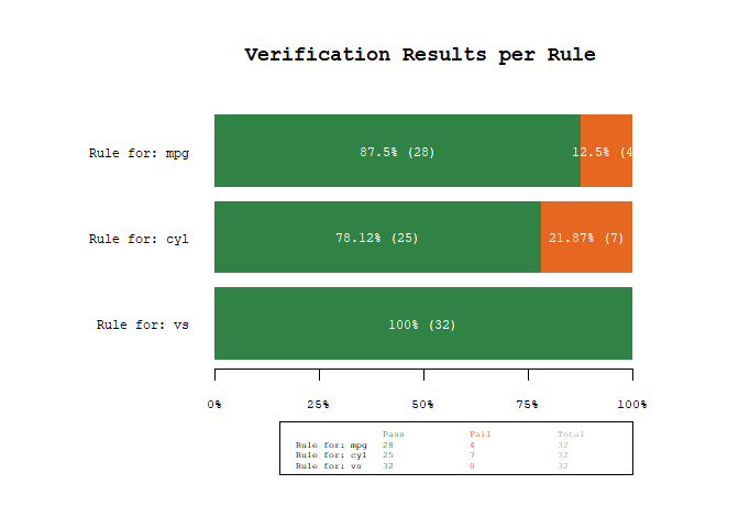 #> 2 Rule for: cyl cyl %in% c(4, 8) FALSE FALSE 32 25 7 "" "" 0.2015200 secs