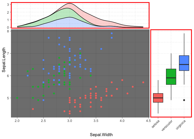 The R package ggside expands on the ggplot2 package. This package allows the user to add graphical information about one of the main panel’s axis. This is particularly useful for metadata for discrete axis, or summary graphics on a continuous axis such as a boxplot or a density distribution.