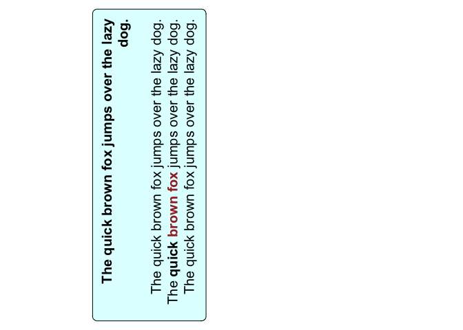The function textbox_grob() is intended to render multi-line text labels that require automatic word wrapping. It is similar to richtext_grob(), but there are a few important differences. First, while richtext_grob() is vectorized, textbox_grob() is not. It can draw only a single text box at a time. Second, textbox_grob() doesn’t support rendering the text box at arbitrary angles. Only four different orientations are supported, corresponding to a rotation by 0, 90, 180, and 270 degrees.