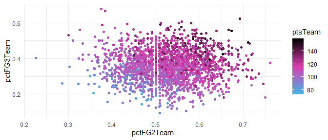 nba_results2020 ggplot(aes(pctFG2Team, pctFG3Team)) +