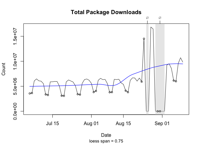 Missing: 2025-08-25, 2025-08-26, 2025-08-29, 2025-08-30, 2025-08-31, 2025-09-01, 2025-09-02Second, when plotting cranDownloads() two gray polygons