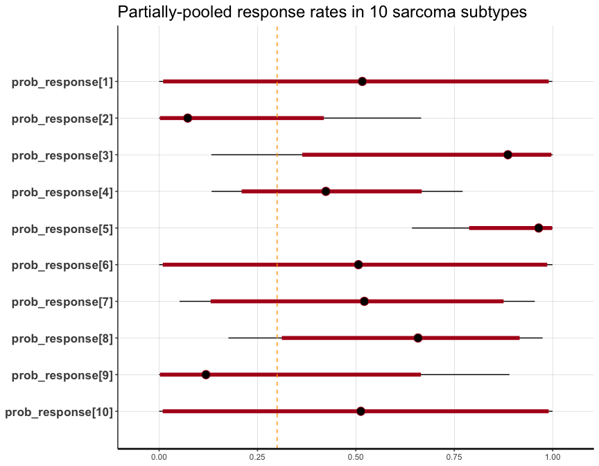labs(title = 'Partially-pooled response rates in 10 sarcoma subtypes')
