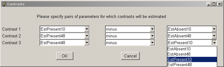 The "Advanced" button can be used to enter the contrasts as a matrix or to see the corresponding contrasts matrix obtained from the paris of arrays selected. The number of pairs of drop down combo boxes is chosen to be one less than the number of unique targets in the Target column of the Targets file as long as this does not exceed ten pairs in total. For now, this total number of contrasts must be the same for all contrasts parameterizations, but you can just leave some of the blank if desired. For example, you may choose to use only one comparison, EstPresent10 vs EstAbsent10.