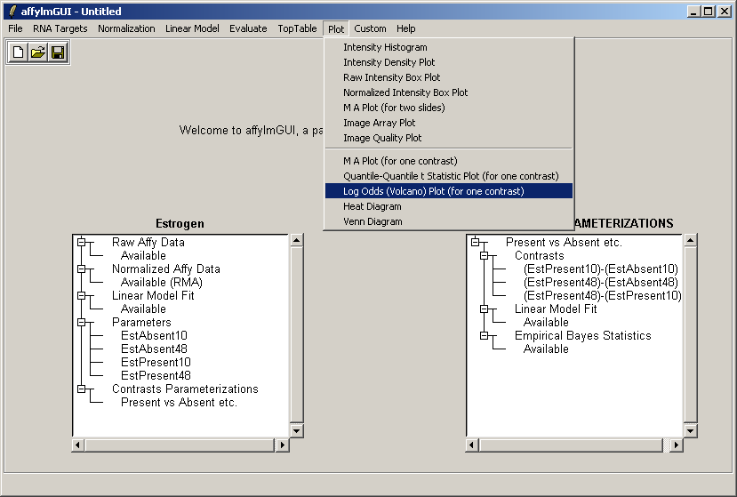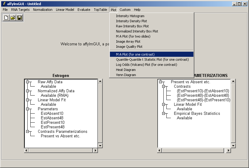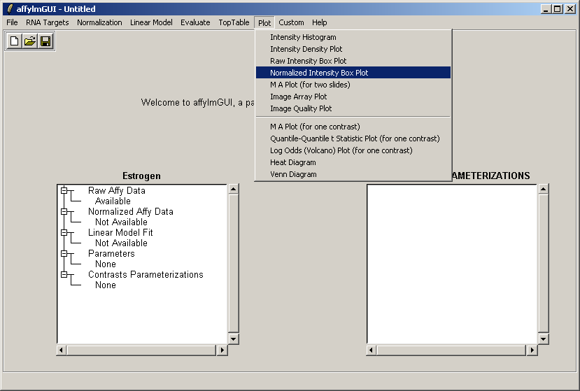 The left status window now reflects the fact that normalization is complete. For users who are familiar with some R commands, the raw and normalized data objects are available as "RawAffyData" and "NormalizedAffyData" in the "Evaluate R Code" window, found in the "Evaluate" menu.