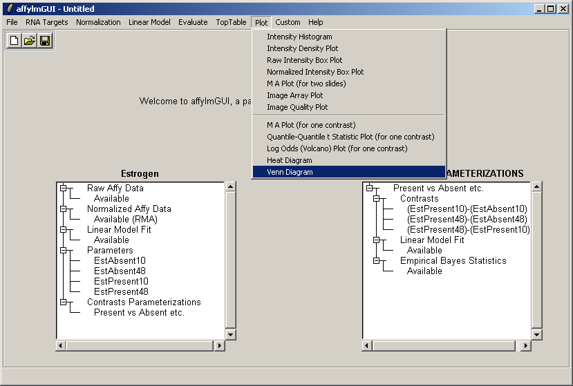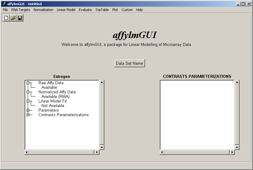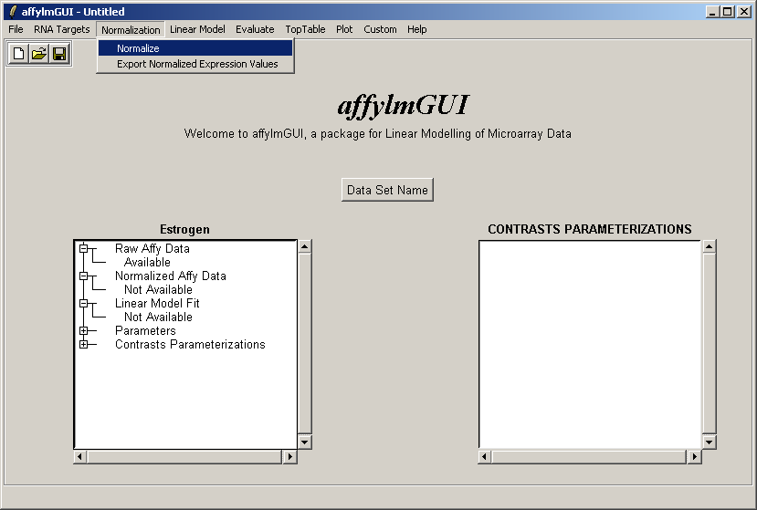 The main window of affylmGUI is shown above. From the File menu, click on "New" to begin a new analysis.