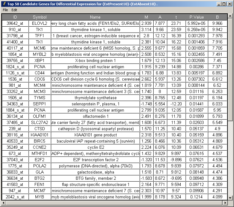 The resulting table is shown above. This table can be saved as tab-delimited text and then opened in a spreadsheet program such as Excel. Genes with low P-values, large (absolute) t statistics or large B statistics are judged by the limma package to be differentially expressed with some reasonable consistency between replicates.