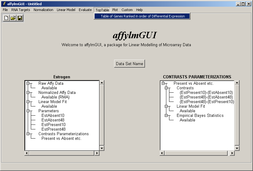 After the data has been loaded the left status window is updated in the main affylmGUI window.