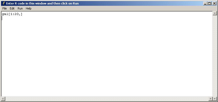 The user is presented with a text window in which R code can be entered. We will use this interface to check the first 20 rows of the GAL file, which is stored in an R object called "gal", within the environment limmaGUIenvironment. FOR ADVANCED USERS: When using the "Evaluate R Code" window, it is not necessary to use get("gal",envir=limmaGUIenvironment) because commands in this window are automatically evaluated in limmaGUIenvironment.