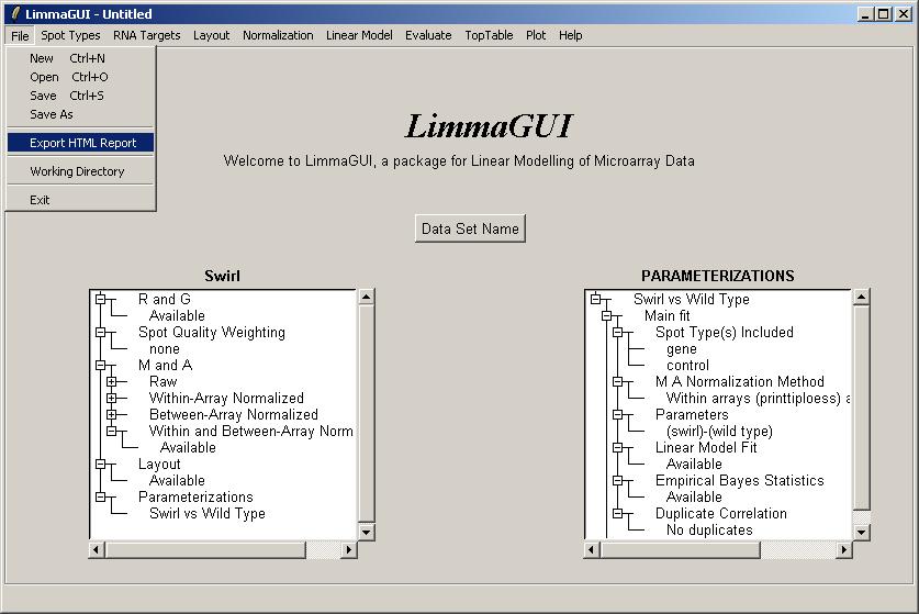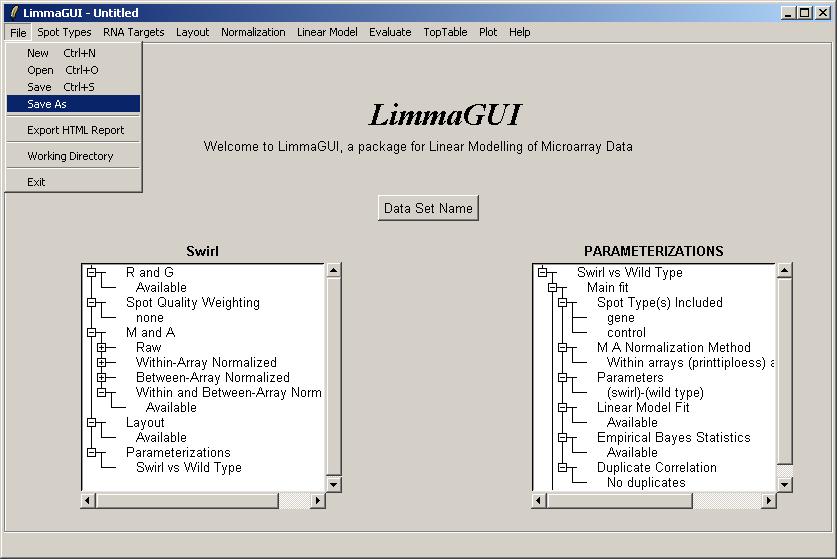 (Advanced users may be interested to know that the .lma file saved by limmaGUI is really just an RData file which can be loaded into an R session. However, it may appear more complicated than a standard .RData file associated with the limma package, because it allows for multiple parameterizations to be stored within a list data structure.)