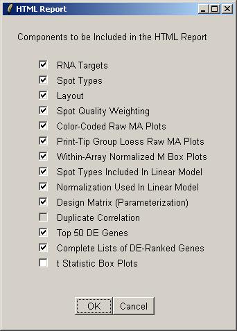 Select the components to include in the HTML report. Some components may not be available if you have not yet computed a linear model, or if you have no duplicates. By default the boxplots of t statistics are not included, because they are most useful for looking at the range of t statistics for the controls, e.g. Scorecard Controls, and often the controls are excluded from the linear model to focus on the real genes.