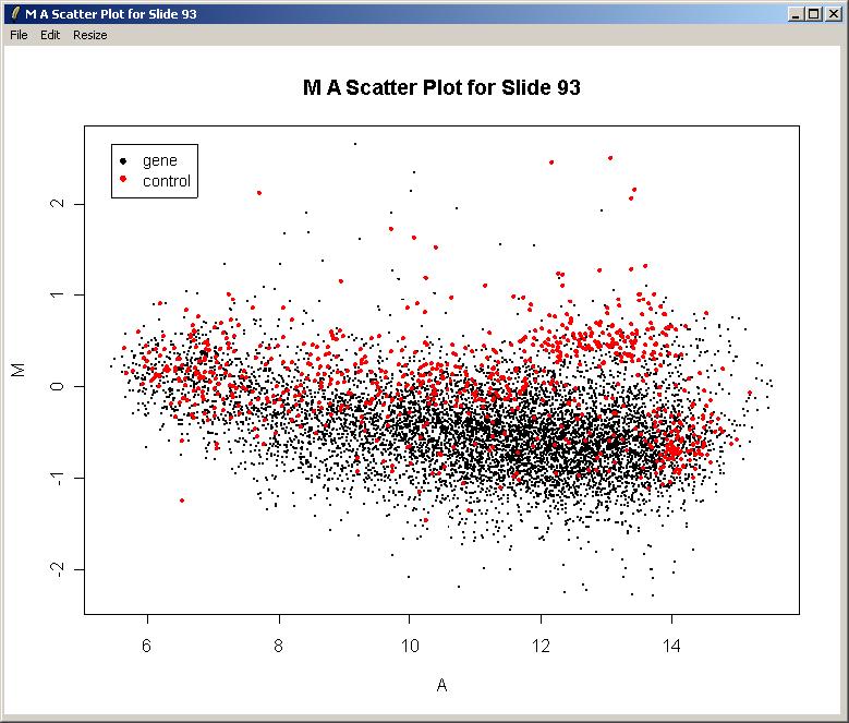 The resulting plot is shown below. There is clearly a need for normalization. There is an obvious intensity effect (i.e. M depends on A) which should be removed by normalization later on.