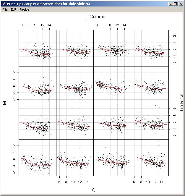 Now we will demonstrate how to plot an M vs A scatter plot and corresponding loess smoothing curve for each print-tip group on an array. From the Plot Menu, select "Print-Tip Group M A Plot (for one slide)".