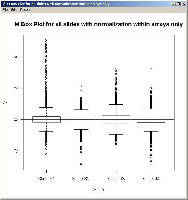 Choose "Yes" to normalize between arrays (i.e. click "Yes", which is NOT the default value). We choose to normalize between arrays in this case because of a reasonably significant difference in the range of M values for each array, as seen previously in a box plot.
