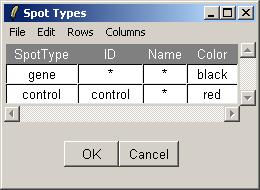 The Spot Types table can viewed from within limmaGUI in a similar manner. Unlike the RNA Targets table, the Spot Types table is actually editable within limmaGUI. You can change the default colors associated with each spot type and you can even create new spot types and save the table to a tab-delimited text file. The arrow keys can be used to select the active cell in the table, while holding down Control and using the arrow keys will move the cursor within the text in one cell. The Rows menu can be used to add or delete spot types.