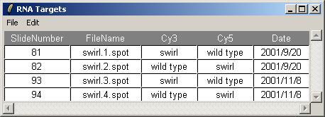 The Targets file should be stored in tab-delimited text which can be generated by a spreadsheet program, such as Excel. The Swirl Targets file is shown below. (It can be viewed from within limmaGUI by clicking on "View RNA Targets" in the RNA Targets menu.)