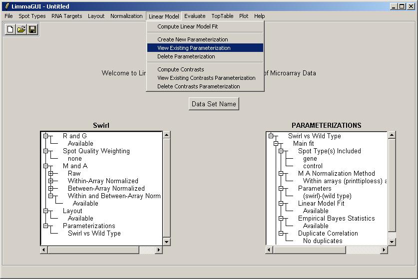 Statisticians can note that we did not explicitly enter a design matrix when defining the parameter to be estimated in the linear model for each gene. We will enter a design matrix for the Weaver data set. For the Swirl data set, we will at least demonstrate how to view the parameterization, either as a simple comparison between the two RNA types, or as a design matrix. From the Linear Model menu, click on "View Existing Parameterization".
