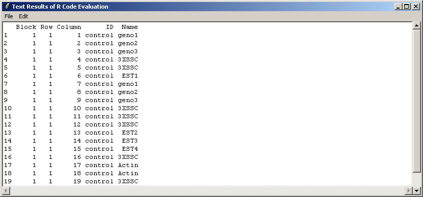 The design matrix is shown below. The matrix can be saved as tab-delimited text or copied and pasted into a spreadsheet program.