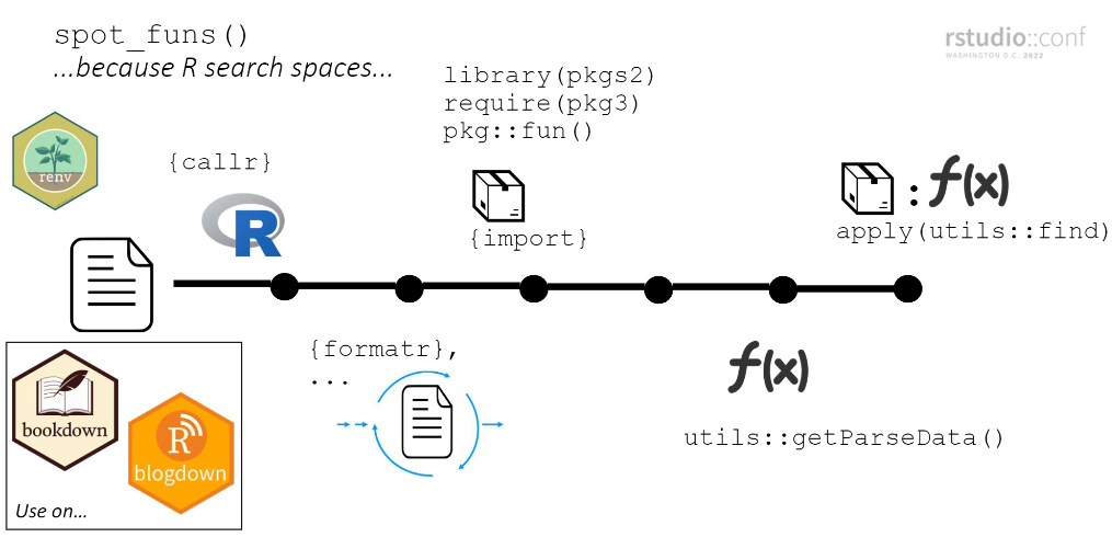 worksThe goal of funspotr (R function spotter) is to make it easy to identify which R functions and packages are used in files and projects. It was initially written to create reference tables of the functions and packages used in a few popular github repositories1.
