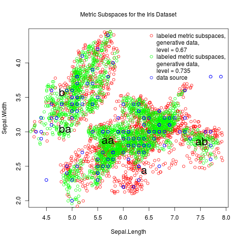 The inserted images show two-dimensional projections of generative data contained in metric subspaces with assigned labels for the iris dataset.