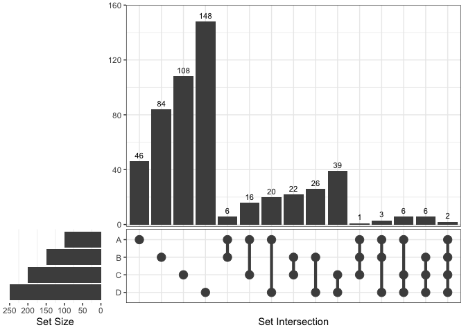 #> 15 1/2/3/4 A/B/C/D <chr [0]> 0If only several items were included, intersections may also be viewed