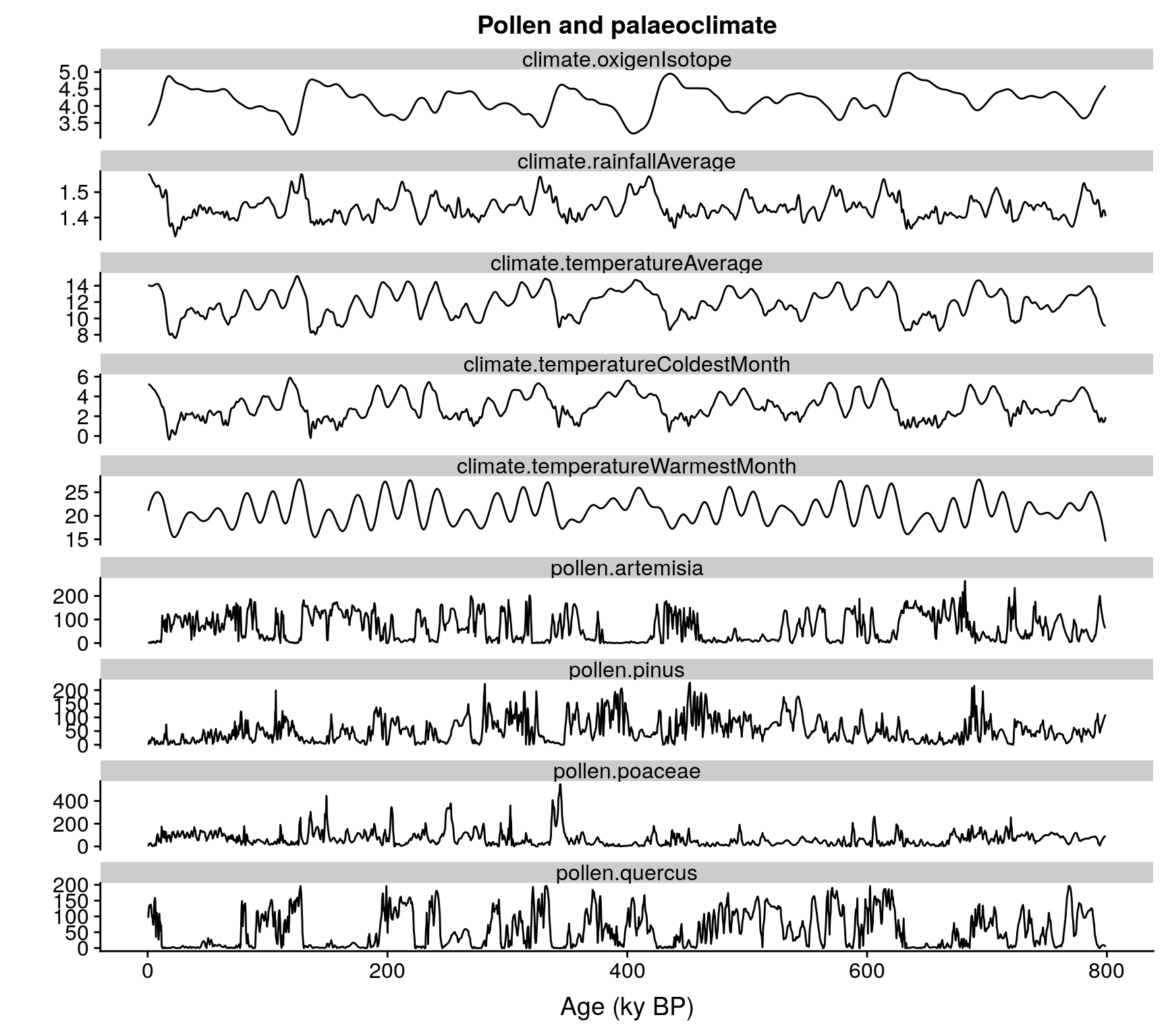 The datasets are not aligned, and pollen is not sampled at regular times, which makes any kind of analysis challenging. The code below fixes these issues by merging the data into the same regular time grid through the function mergePalaeoData. The function warns the user when the interpolation factor (difference between the original temporal resolution of the data and the interpolated resolution) is higher than one order of magnitude. Please, check the help file of the function to better understand how it works.