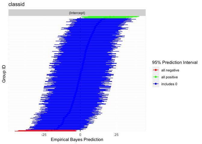 Rich visualizations of associations can be had along with caterpillar plots, which graph the 95% prediction intervals for the random effects.