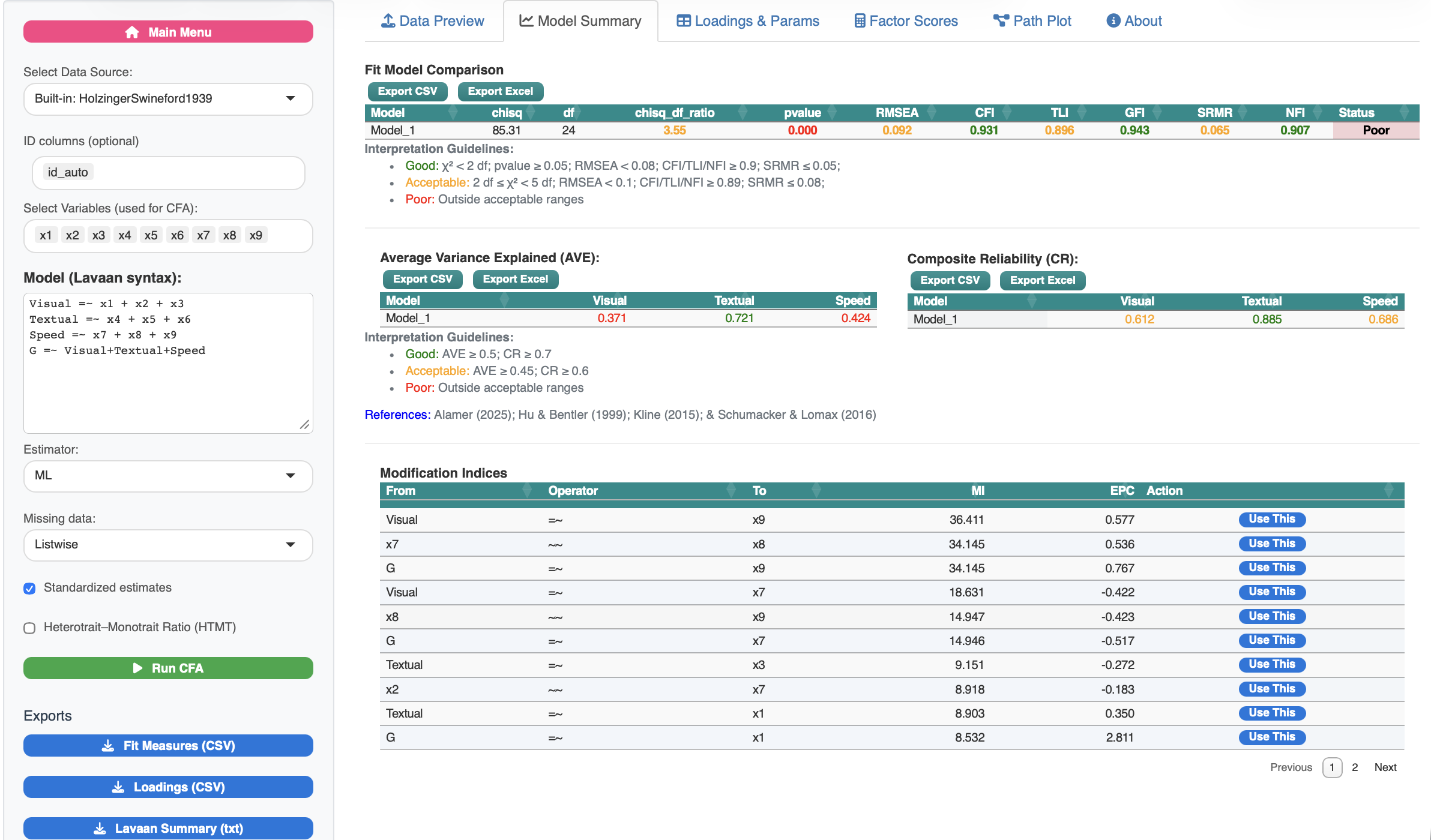 All analyses can be performed without writing any code, making the package accessible for researchers, students, and applied analysts.