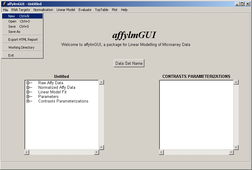 To begin using affylmGUI, you will need to create an RNA Targets file, which is a tab-delimited text file with three columns: Name, FileName and Target: