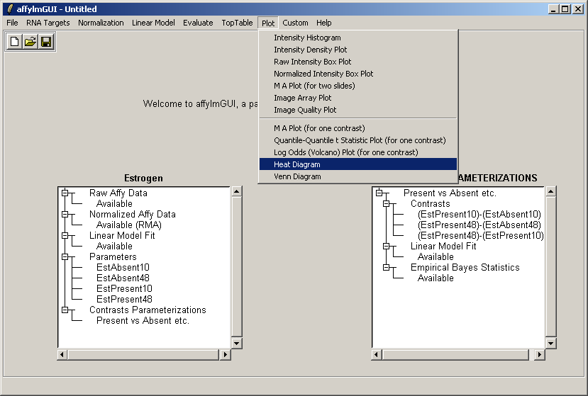 The main window of affylmGUI is shown above. From the File menu, click on "New" to begin a new analysis.
