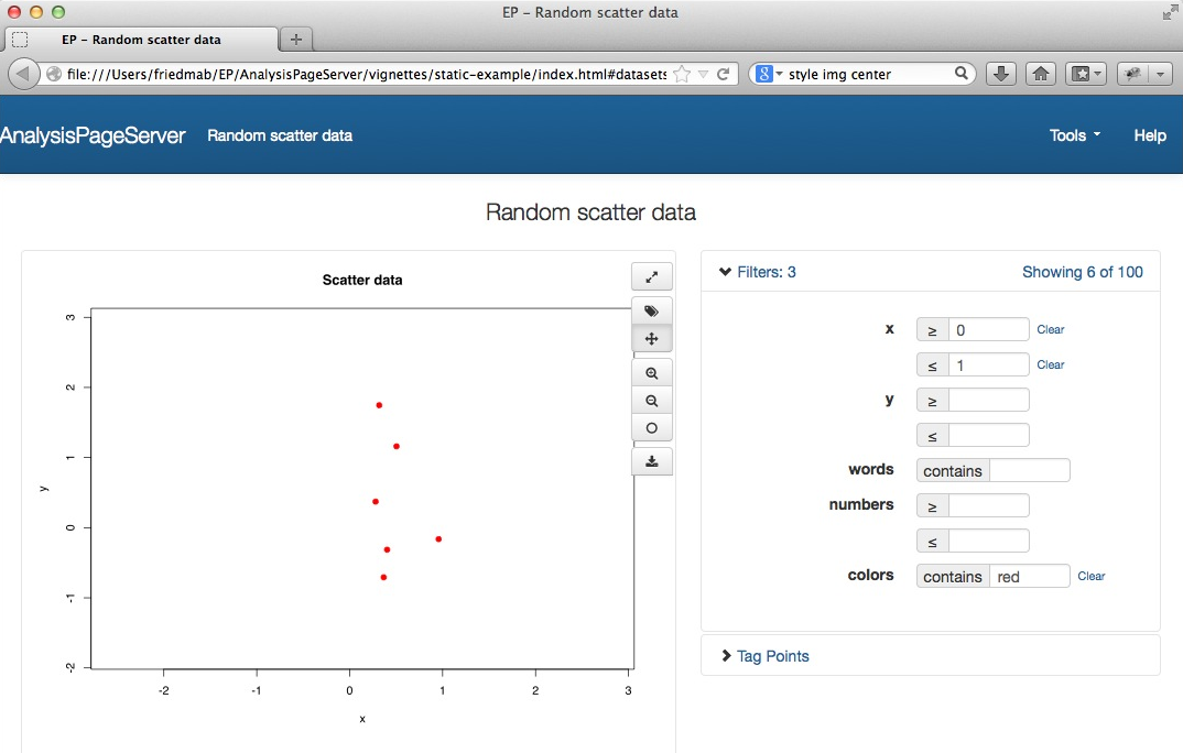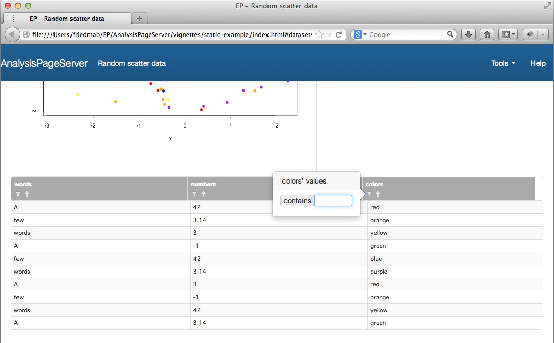 Not only does the AnalysisPageServer display your data and plot, it also implements sorting, numeric and text filtering, selecting and tagging points, zoom, full screen mode, and download. Using the example data set this document will walk you through each of these interactions.