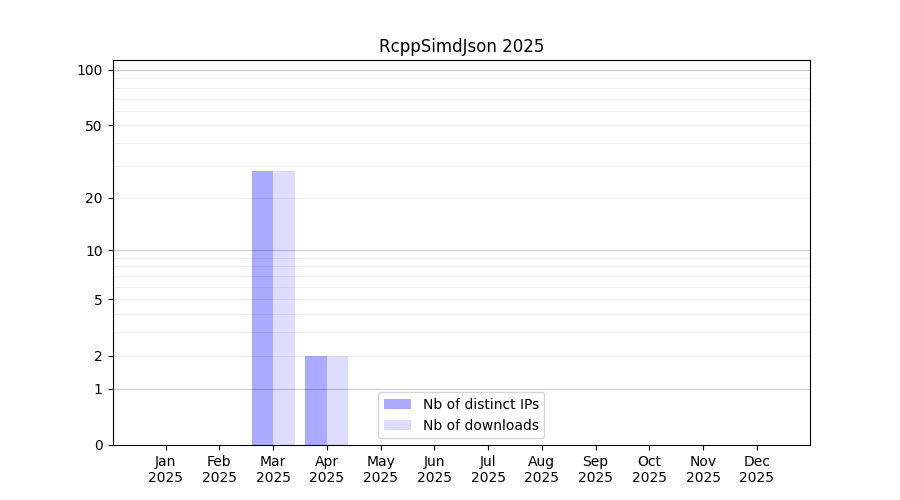 Number of downloads for workflow package RcppSimdJson, year by year, from 2025 back to 2015 (years with no downloads are omitted):