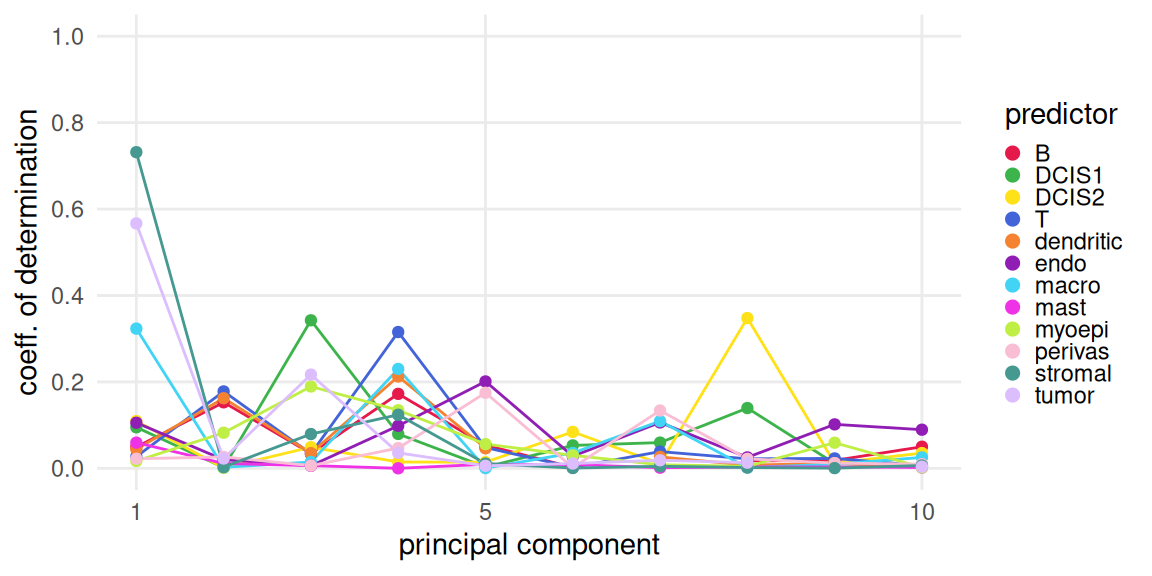 Here we plot the coefficient of determination of the first 10 PCs for each cell type.