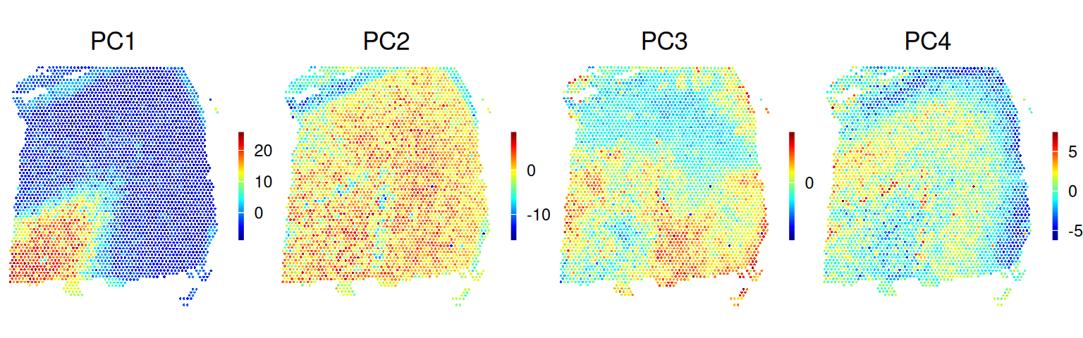 Inspecting the spatial distribution of the top PCs, we can observe that the main driver of expression variability is the distinction between white matter (WM) and non-WM cortical layers.