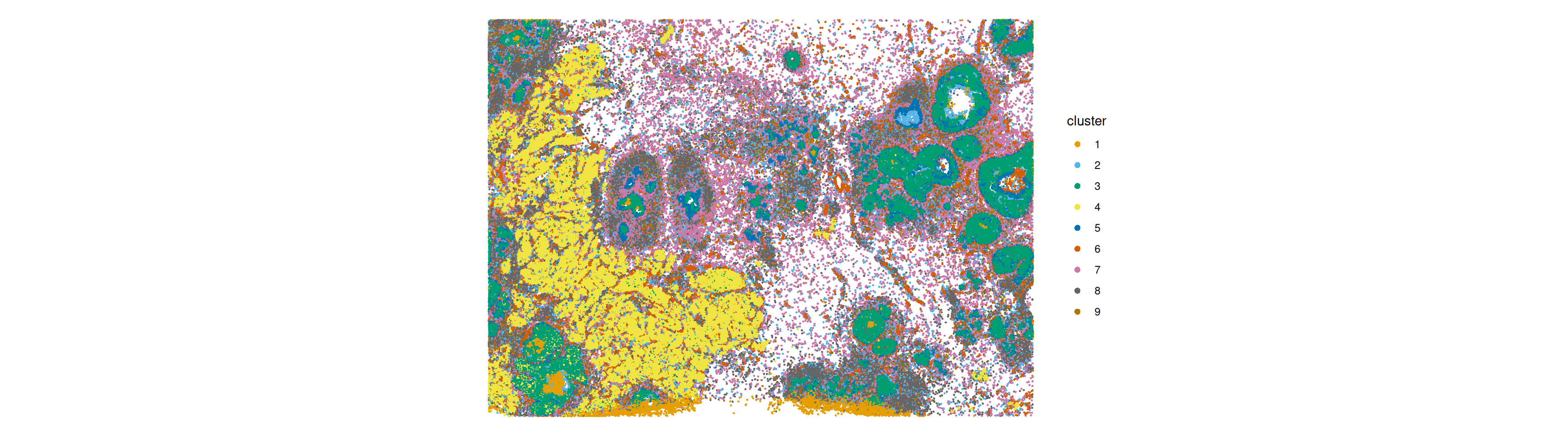# code adapted from # https://robinsonlabuzh.github.io/# pasta/04-imaging-multivar-latSOD.html# dependencieslibrary(BiocNeighbors)library(BiocSingular)library(bluster)library(scater)# log-library size normalizationsfe<-logNormCounts(sfe)# set seed for random number generation# in order to make results reproducibleset.seed(123)# run PCA on the samplesfe<-runPCA(sfe, exprs_values="logcounts", ncomponents=50)# cluster based on first 10 PC's # using Leiden community detectionpcs<-reducedDim(sfe, "PCA")[, 1:10]params<-KNNGraphParam( k=20, cluster.fun="leiden", cluster.args=list( resolution=0.3, objective_function="modularity"))colData(sfe)$cluster<-clusterRows(pcs, BLUSPARAM=params)# visualize cluster assignmentsplotSpatialFeature(sfe, features="cluster", colGeometryName="centroids")+guides(col=guide_legend(override.aes=list(size=2)))