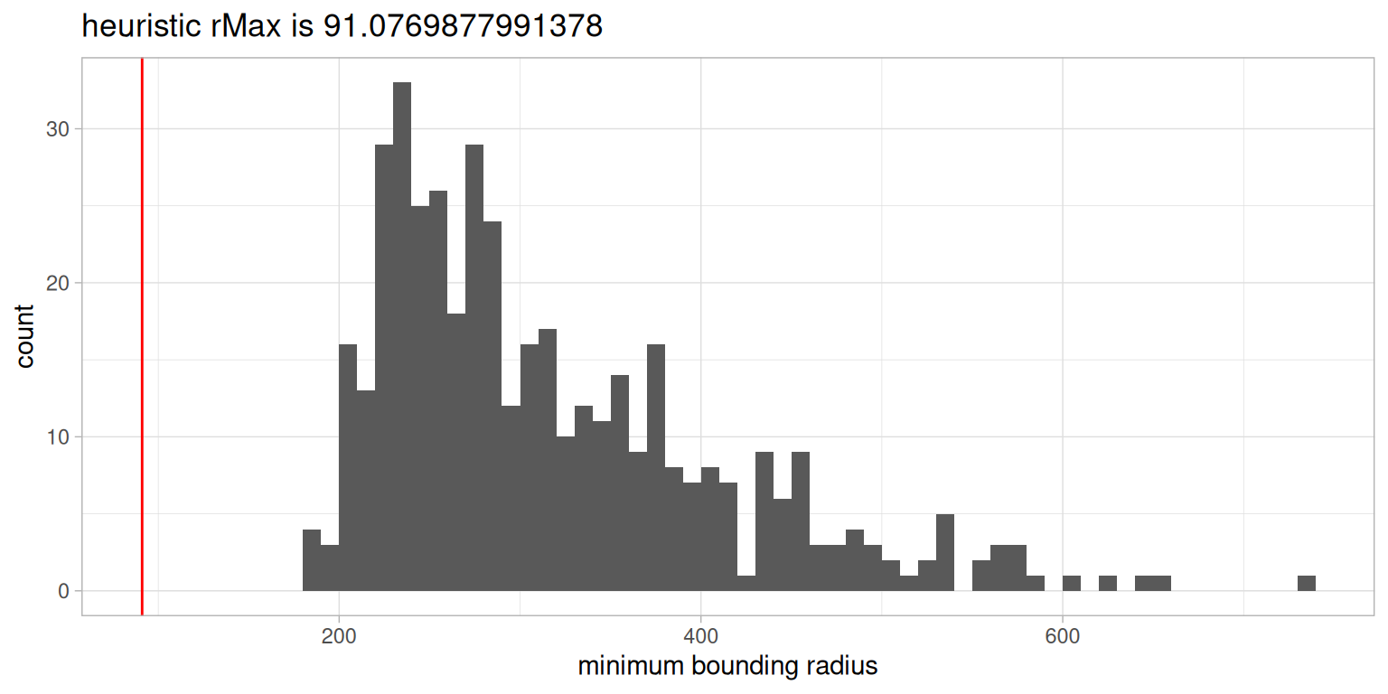 The first important question is in what range we want to consider interactions. We provide a generalisation of a guideline for the maximum radius provided by Baddeley, Rubak, and Turner (2015), which suggests to not consider any radii beyond \(1/2\) of the bounding-circle radius of an image, as else effects at the border of a FOV become too extreme.