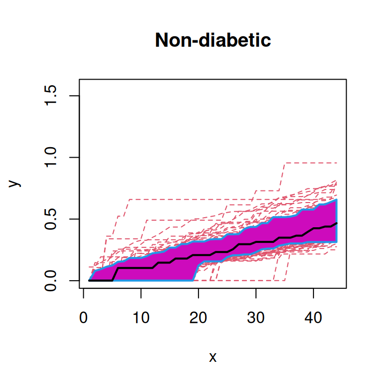 From these plots, we note that the functions from ‘Onset’ patients seem to qualitatively have a higher median curve than those from ‘Non-diabetic’ or ‘Long-duration’ patients.
