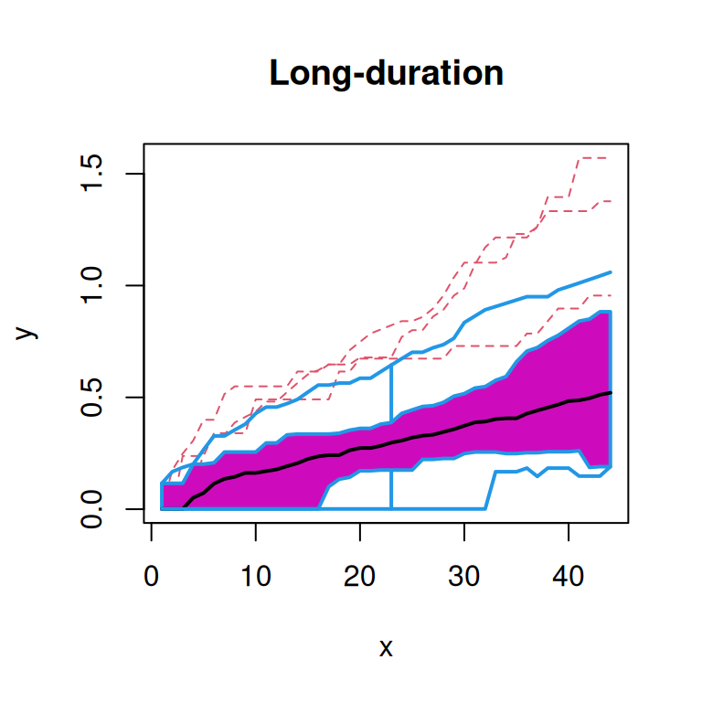 First, we will plot the functional box plot of the transformed spatial statistics functions (Sun and Genton 2011). Here, the black line indicates the median curve, the purple region is the 50% central region, and the red lines indicate outliers.