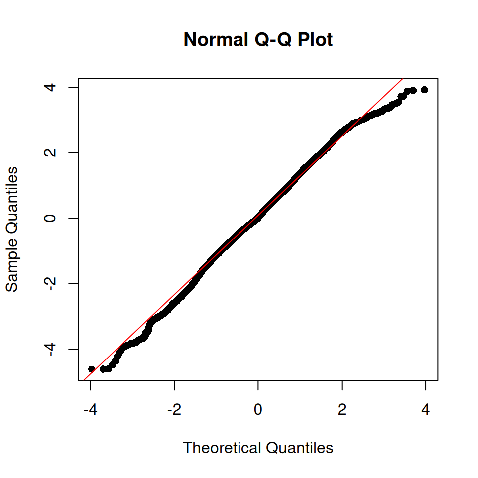 The Q-Q plot indicates a reasonable model fit, although not perfect.