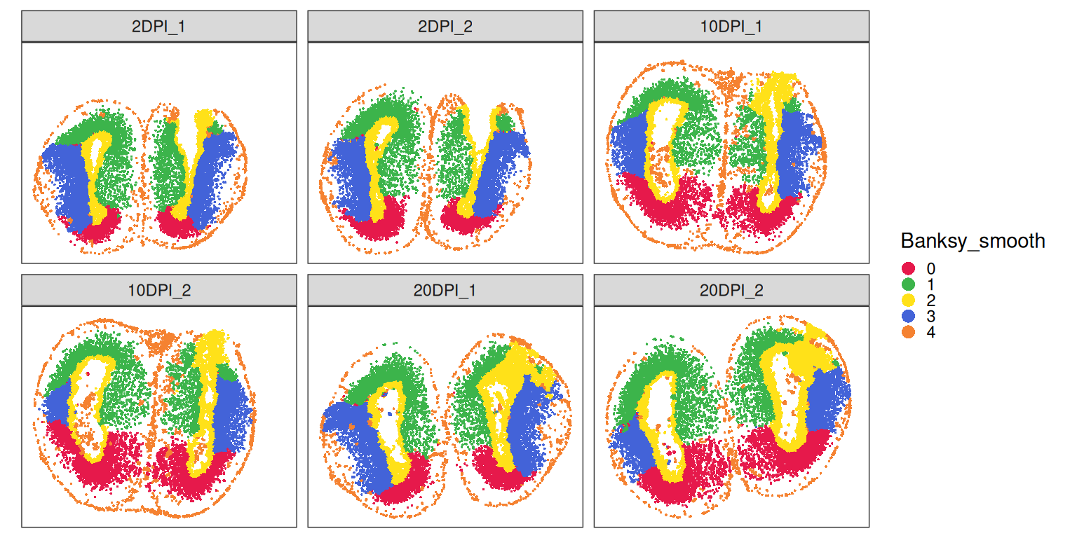 For computational reasons, we use 3 stages in this chapter – 2, 10, and 20 days post injury (DPI) – and only two sections per stage. The analysis framework uses pre-computed spatial domains generated with Banksy (Singhal et al. 2024) (see Chapter 27). For preprocessing details of this dataset, see the muSpaData Bioconductor package.