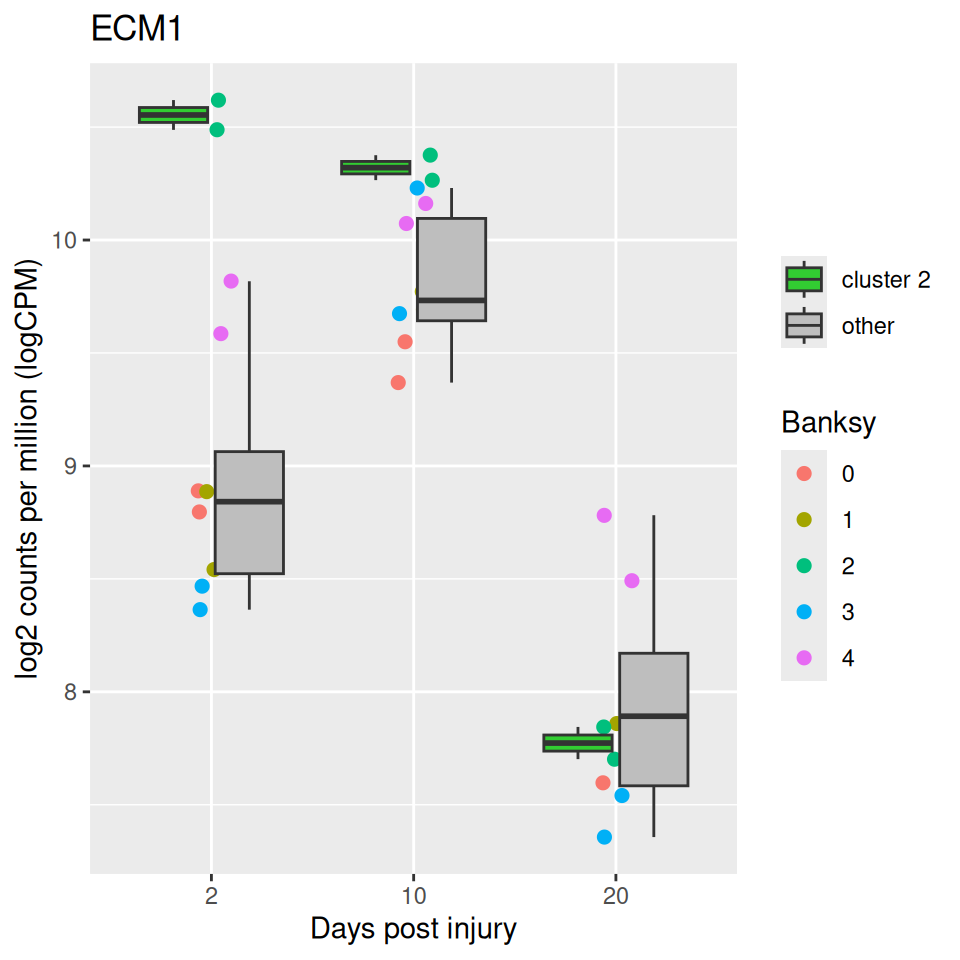 The boxplots below show the average log-CPM for cluster 2 and for all other clusters (excluding cluster 2) across different time points. The largest difference between cluster 2 and the remaining clusters is observed at 2 DPI, with the difference decreasing over time. At 20 DPI, no significant log-CPM differences are observed between the clusters. This suggests that spatial patterns change across conditions (i.e. time stages).