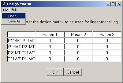 The table widget below allows the advanced user to enter a design matrix directly. Click on "Open" from the File menu to open a tab-delimited design matrix file. (A tab-delimited file can be created in a spreadsheet program such as Excel.)