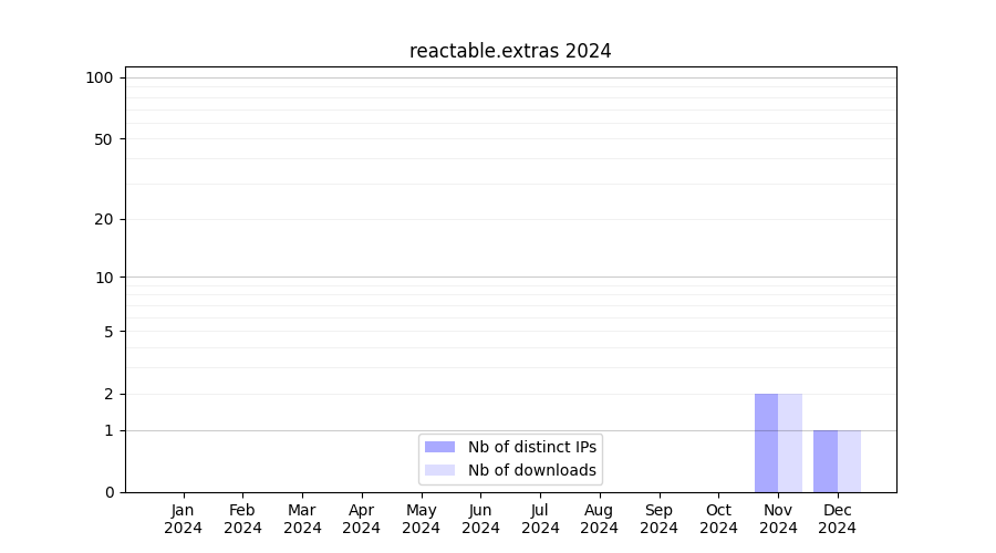 Number of downloads for workflow package reactable.extras, year by year, from 2025 back to 2015 (years with no downloads are omitted):