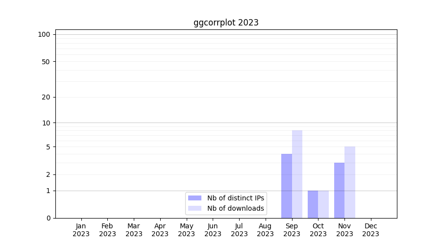 Number of downloads for annotation package ggcorrplot, year by year, from 2025 back to 2014 (years with no downloads are omitted):