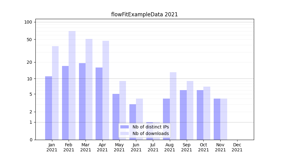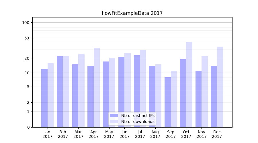 Number of downloads for experiment package flowFitExampleData, year by year, from 2025 back to 2014 (years with no downloads are omitted):