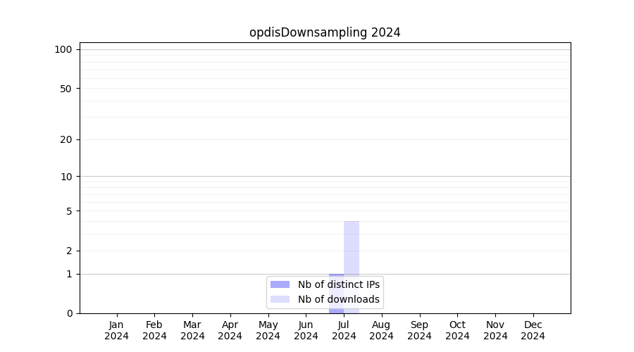 Number of downloads for experiment package opdisDownsampling, year by year, from 2025 back to 2014 (years with no downloads are omitted):