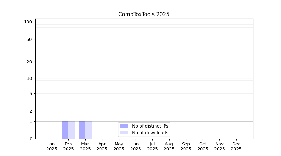 Number of downloads for workflow package CompToxTools, year by year, from 2025 back to 2015 (years with no downloads are omitted):