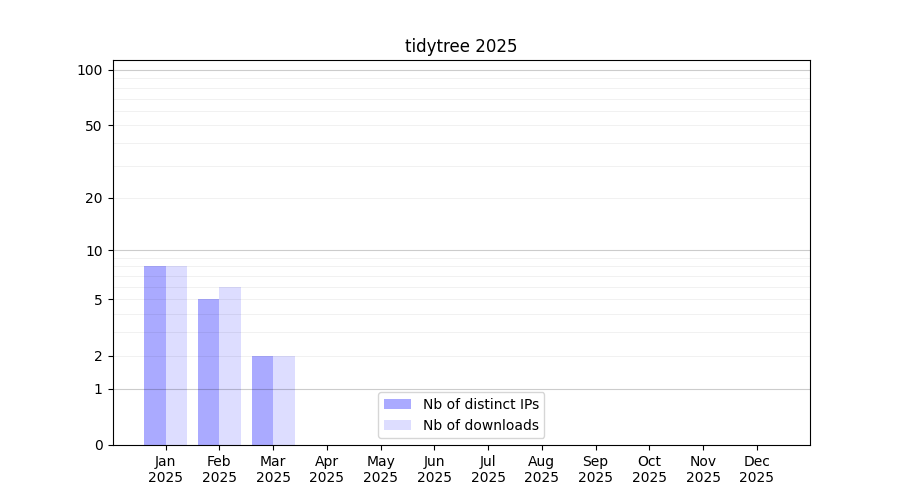 Number of downloads for workflow package tidytree, year by year, from 2025 back to 2015 (years with no downloads are omitted):