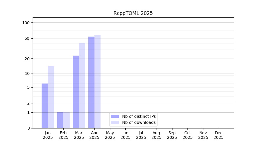 Number of downloads for software package RcppTOML, year by year, from 2025 back to 2014 (years with no downloads are omitted):