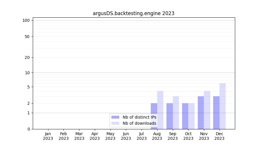 Number of downloads for software package argusDS.backtesting.engine, year by year, from 2025 back to 2014 (years with no downloads are omitted):