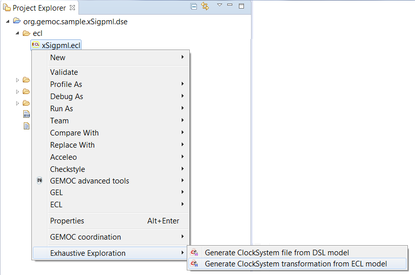 Generate ClockSystem transformation from ECL model as illustrated in figure Figure 9, “Using T1 Tranformation”.T2 is generated in the repository <mtl-gen>.
